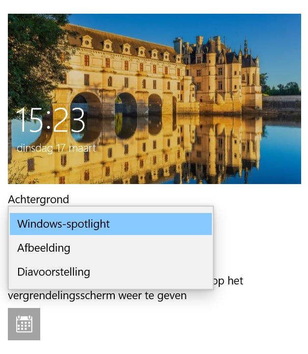 Snel uitgekeken op de achtergrond van het vergrendelingsscherm? Je kunt een eigen achtergrond instellen, maar in plaats daarvan ook gebruikmaken van een wisselende achtergrond. Kies voor de sectie Vergrendelingsscherm en selecteer Windows-spotlight bij Achtergrond.