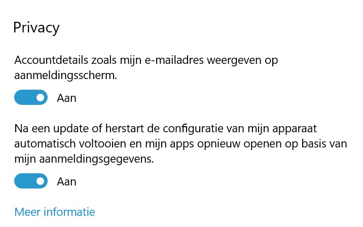 Het vergrendelingsscherm kan nog meer: standaard laat het aanmeldingsscherm niet zoveel informatie over de gebruikersaccount zien. Deze keuze hebben de makers vooral met het oog op privacy gemaakt. Ben je de enige gebruiker van de computer en wil je dat Windows de informatie wel gewoon laat zien? Kies in het instellingenvenster voor Accounts en open de sectie Aanmeldingsopties. In de sectie Privacy zet je de schuif op Aan bij de optie Accountdetails zoals mijn e-mailadres weergeven op aanmeldingsscherm. Om te voorkomen dat het vergrendelingsscherm lang in beeld blijft als je niet bij de computer bent, kies je in het instellingenvenster voor Systeem en kies je voor Energiebeheer en slaapstand. Bepaal bij de sectie Scherm na hoeveel minuten het scherm moet worden uitgeschakeld.