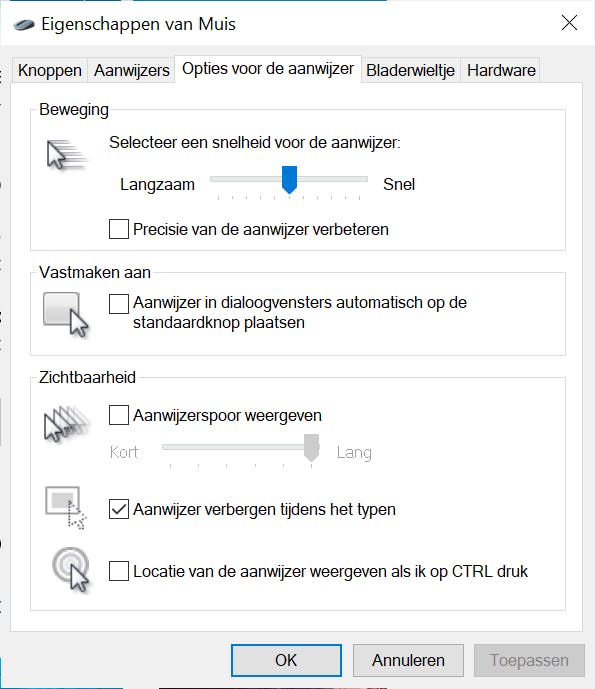 Hoe belangrijk de muis ook is, vaak wordt er weinig aandacht aan besteed. Dat is jammer, omdat Windows de nodige opties in huis heeft voor het gebruik van de muis. In de sectie Thema’s klik je op Muiscursor. Deze optie vind je rechts van de voorbeeldweergave van de huidige thema. Een nieuw venster wordt geopend. Op de tab Aanwijzers kies je bij Schema voor het gewenste schema. Een voorbeeld wordt in het vak rechts getoond. Om de weergave van de muisaanwijzer te verbeteren, kun je kiezen voor een schaduw, die achter de aanwijzer wordt getoond (kies voor Aanwijzerschaduw inschakelen). Tevreden met het nieuwe schema? Open dan het tabblad Opties voor de aanwijzer. Op deze tab vind je aanvullende instellingen voor het gedrag van de aanwijzer, met onder meer in het vak Zichtbaarheid een drietal opties om de muisaanwijzer meer prominent te maken. Zo kun je de muisaanwijzer een spoor laten achterlaten, zodat de positie duidelijker is (Aanwijzerspoor weergeven), kun je ervoor kiezen om de muisaanwijzer altijd in beeld te laten (vink de optie Aanwijzer verbergen tijdens het typen uit) en kun je met een druk op Ctrl de muisaanwijzer laten opvallen (Locatie van de aanwijzer weergeven als ik op Ctrl druk).