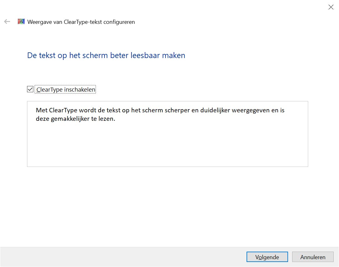 ClearType is alweer enkele versies geleden in Windows geïntroduceerd, maar sinds Windows 10 in de vergetelheid geraakt. Met ClearType worden de letters op het beeldscherm scherper gemaakt. Bepaal zelf of dit het geval is en schakel ClearType uit als je niet tevreden bent. Open het Startmenu en typ Cleartype. Klik op ClearType-tekst aanpassen. Haal het vinkje weg bij de optie ClearType inschakelen en bekijk het voorbeeld. Worden de letters beter getoond, dan kun je ClearType beter uitschakelen. Klik hierna op Volgende. Er vindt nu een controle van de resolutie plaats. Hierna toont de wizard enkele vlakken met voorbeeldteksten. Geef nu aan welke teksten het beste resultaat geven. De wizard toont meerdere schermen en het is de bedoeling dat je in elk venster de gewenste resolutie aangeeft. Deze stap is helaas ook nodig als je ClearType juist hebt uitgeschakeld.