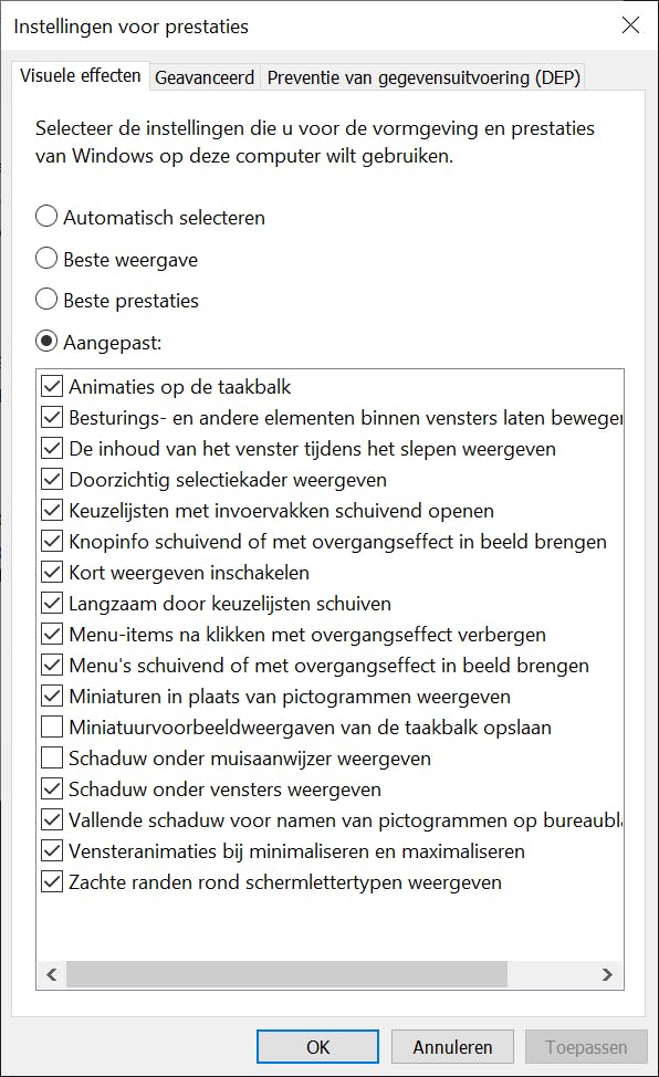 Op het eerste gezicht geeft Windows weinig instellingen voor het aanpassen van de visuele effecten van het systeem. Dit komt omdat de meeste instellingen uit eerdere Windows-versies nu zijn ondergebracht in het vereenvoudigde instellingenvenster. Niet alle opties zijn echter netjes ‘meeverhuisd’. We laten ons hierdoor niet van de wijs brengen. In het instellingenvenster (Windows-toets+I) kies je voor Systeem. Ga naar Info en klik rechtsboven in het venster op Systeeminfo. Een nieuw, klassiek eigenschappenvenster verschijnt. Open het tabblad Geavanceerd en klik op de knop Instellingen in het vak Prestaties. Een nieuw venster opent, met de tab Visuele effecten. Kies voor Aangepast. Via de lijst heb je toegang tot een flinke hoeveelheid minder bekende instellingen: zo kun je vensters een schaduw geven, zachte randen rond letters inschakelen en bepalen of de inhoud van vensters tijdens het verslepen moet worden getoond of juist tijdelijk mag worden verborgen. Nadat je alle instellingen hebt doorlopen, sla je de nieuwe instellingen op via een klik op OK.