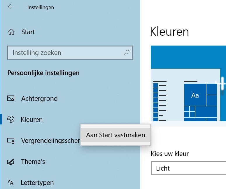 Onderdelen in het instellingenvenster die je vaak gebruikt, kun je toevoegen aan het Startmenu. Ze worden dan als tegel in het menu geplaatst en zijn snel toegankelijk. Het toevoegen van deze tegels gaat eenvoudig: klik met de rechtermuisknop op de sectie in het instellingenvenster die je wilt toevoegen. Bijvoorbeeld: de sectie Kleuren uit het onderdeel Persoonlijke instellingen. Kies voor Aan Start vastmaken. Open vervolgens het Startmenu en controleer of de tegel is verschenen. Voortaan hoef je niet meer het instellingenvenster eerst te openen. Heb je een groot scherm en maak je intensief gebruik van tegels in het Startmenu, dan kun je het Startmenu meer tegels laten weergeven. Open de sectie Start in het instellingenvenster en zet de schuif op Aan bij Meer tegels weergeven in Start. Controleer direct de andere instellingen in deze sectie, om het uiterlijk van het Startmenu verder aan je wensen aan te passen.
