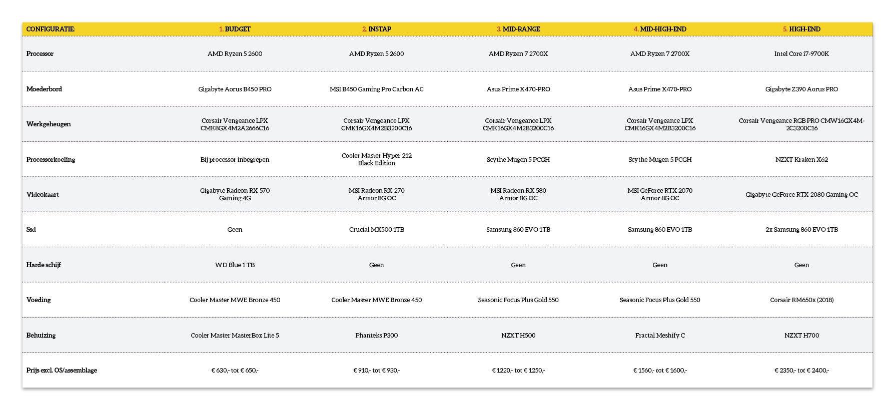 We hebben in de tabel op basis van de drie grote lijnen een vijftal kant en klare adviezen voor je neergezet: de low-budgetinstapper, de gebalanceerde instapper, de volbloed middenklasser, de chique alleskunner en de echte game-patserbak. Lijsten waarmee je direct aan de slag kunt. En als je toch nog twijfelt of liever niet zelf met de schroevendraaier aan de slag gaat: je kunt er ook zo mee naar jouw favoriete computershop.