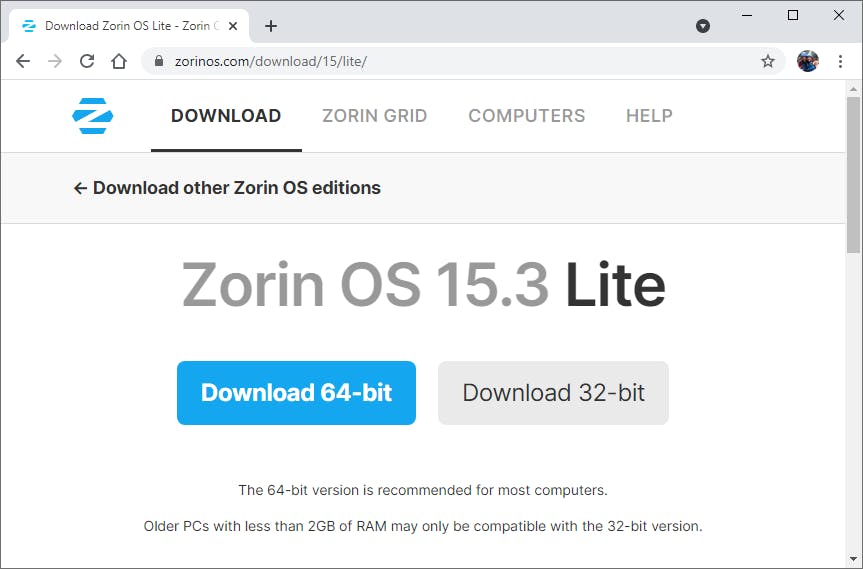 Je gaat eerst het juiste installatiebestand ophalen. Surf naar www.zorinos.com en klik op Download Zorin OS. Scrol nu een stukje omlaag totdat je de Lite-versie ziet staan. Bevestig met Download / Skip to download. Je hebt keuze tussen een 32- en 64bit-versie van het besturingssysteem. Voor een oud systeem heb je waarschijnlijk de 32bit-versie nodig. Klik in dat geval op Download 32-bit en wacht het downloadproces af. Gezien de bestandsgrootte van ruim 2 GB kan dat even duren.
