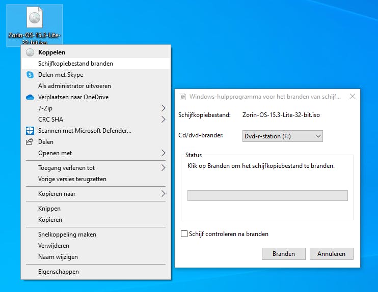 Heb je geen usb-stick die je voor de installatie van Zorin OS kunt gebruiken? Je brandt het installatiebestand als alternatief op een dvd. Vanzelfsprekend dient de beoogde computer dan wel over een cd/dvd-station te beschikken. Stop het schijfje in de computer en klik met de rechtermuisknop op het iso-bestand van Zorin OS. Via Schijfkopiebestand branden / Branden maak je de installatieschijf. In tip 4 dien je het systeem in plaats van de usb-stick nu vanaf de dvd op te starten.