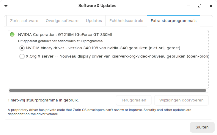 Linux-distributies hadden enige tijd de naam dat ze randapparatuur matig ondersteunen. Tijden veranderen, want Zorin OS accepteert zo’n beetje iedere usb-stick, externe harde schijf, webcam, printer, pc-speakerset, muis en toetsenbord. Steek gewoon de usb-kabel in een vrije poort en de betreffende hardware werkt waarschijnlijk meteen. Je kunt bovendien (een tweede) scherm op een VGA-, DVI- of HDMI-poort aansluiten. Stuit je onverhoopt toch op moeilijkheden, dan kun je wellicht rechtstreeks de benodigde driver ophalen. Klik hiervoor op de startknop en navigeer naar Instellingen / Extra stuurprogramma’s. Ontdek of er voor aangesloten hardware een alternatieve driver beschikbaar is en installeer die naar eigen inzicht op het systeem. De kans is groot dat het betreffende randapparaat nu wél functioneert.