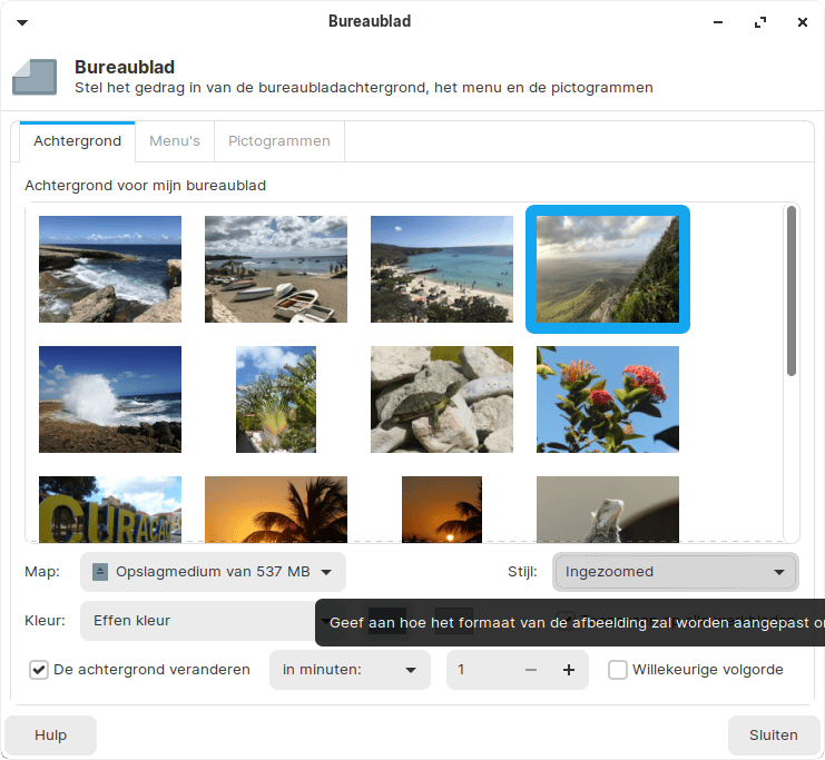 Koppel een usb-stick of externe harde schijf met fotobestanden en klik achter Map op backgrounds. Je klikt vervolgens op de aangesloten externe datadrager, waarna je naar de juiste map bladert. Kies daarna een foto die je voortaan permanent wilt weergeven. Of wil je steeds wisselen van foto? Vink dan onderaan de optie De achtergrond veranderen en bepaal na hoeveel seconden, minuten of uren je wilt wisselen. Je selecteert hierbij eventueel de optie Willekeurige volgorde. Sluit het venster rechtsboven met het kruisje.
