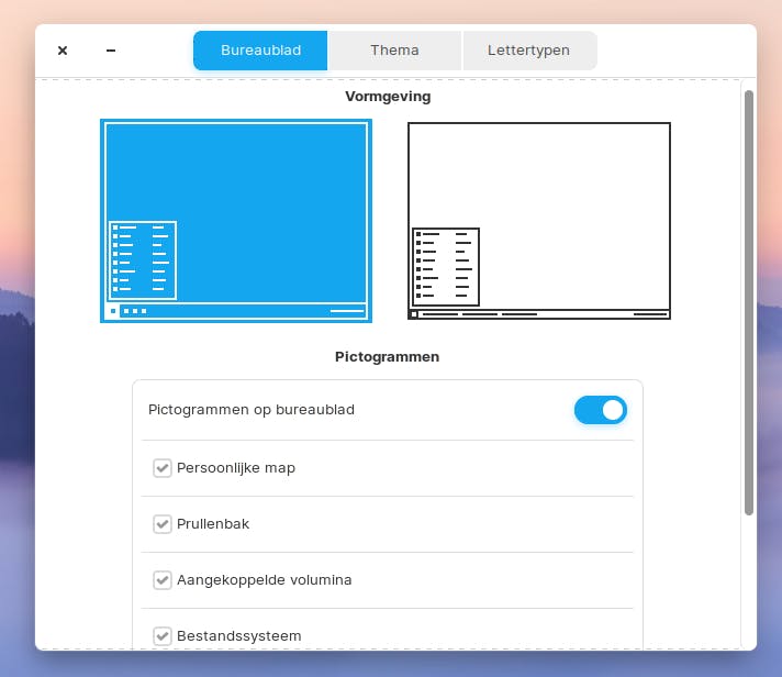 Je voegt eenvoudig diverse systeempictogrammen aan het bureaublad toe. Ga in het startmenu naar Instellingen / Zorin Appearance. In plaats van pictogrammen kun je eventueel ook de volledige programmanamen in de taakbalk weergeven. Klik onder Vormgeving op het tweede beeld. Vink verder naar eigen wens de onderdelen Persoonlijke map, Prullenbak, Aangekoppelde volumina en Bestandssysteem aan. Deze onderdelen verschijnen meteen op het bureaublad. Gebruik ten slotte bovenaan de opties Thema en Lettertypen om diverse uiterlijke kenmerken van Zorin OS aan te passen.