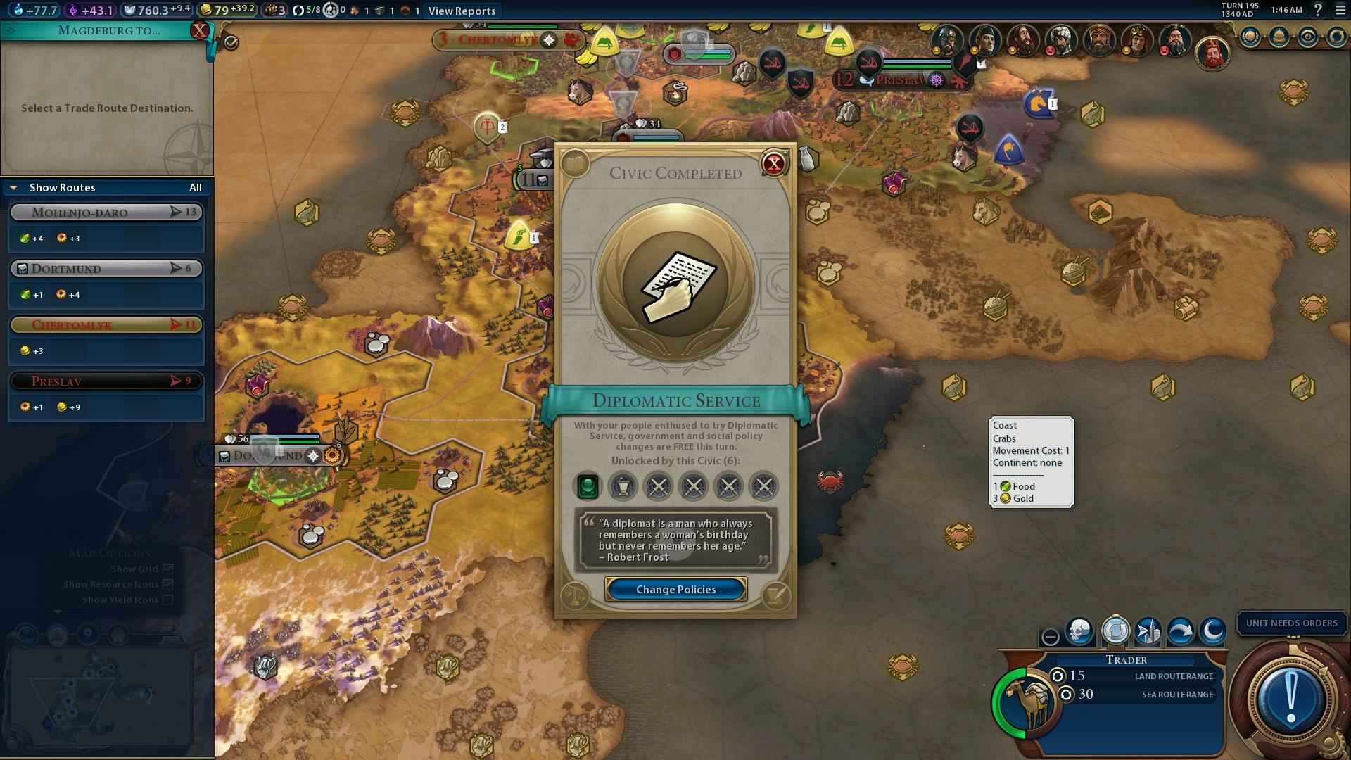 Dit systeem geeft je de vrijheid om je speelstijl een extra zet te geven, of beter te reageren op een veranderende situatie. Als bijvoorbeeld een periode van rust bruut wordt verstoord door een onverwachte oorlogsverklaring van die verraderlijke Gandhi, kun je met een paar militaire Policies de trainingstijd van cavalerie halveren en intussen de verdediging van je steden verstevigen.