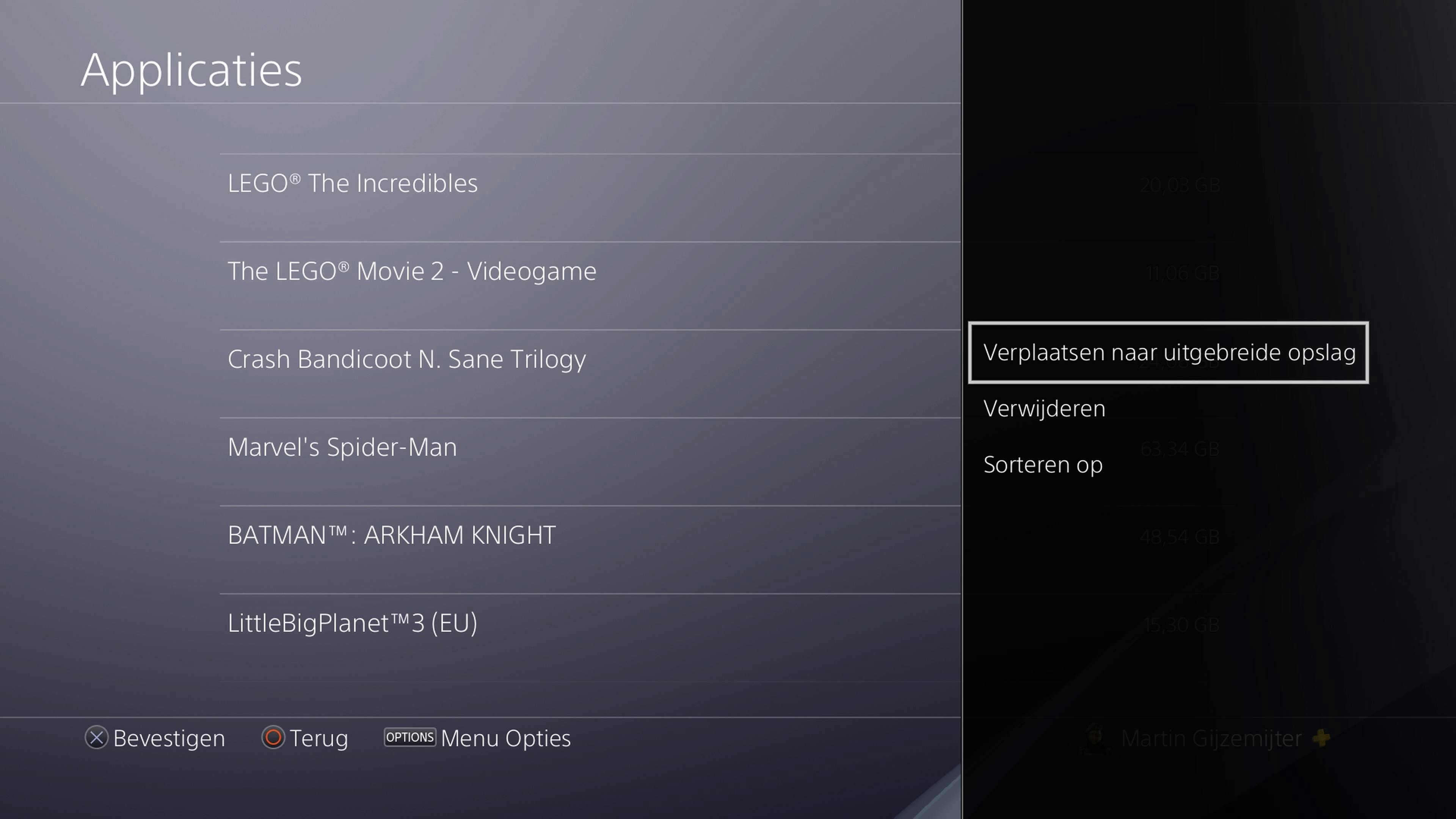 Je hebt de schijf nu gereed gemaakt voor gebruik, maar de schijf in de PS4 zit natuurlijk nog steeds net zo vol. Als deze zo vol zit dat je niet eens meer screenshots en video’s kunt opslaan, dan is het een goed idee om spellen over te zetten van de interne harde schijf naar de externe. Dit kun je direct doen na het formatteren van de harde schijf, maar als je deze optie hebt gemist, dan navigeer je naar Instellingen / Opslag. Selecteer Systeemopslag en druk op de Options-toets op je controller. Kies voor Verplaatsen naar uitgebreide opslag. Plaats nu een vinkje bij de titel(s) die je wilt overzetten naar de externe harde schijf en vervolgens op OK.