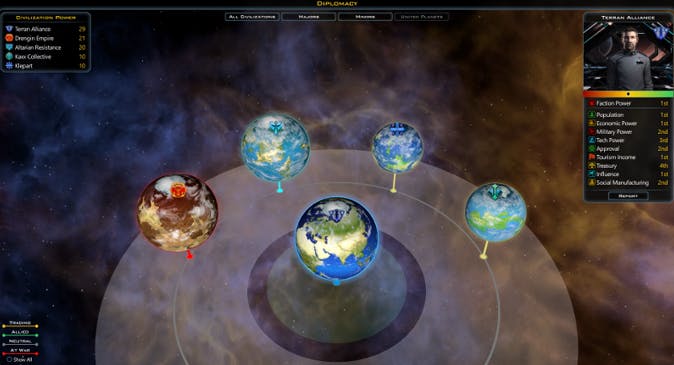 De balans van Galactic Civilizations 3 kan nog wat werk gebruiken. Naarmate je rijk groter groeit, wordt het moeilijker om je bevolking vrolijk te houden. Het antwoord op dit vraagstuk is het bouwen van gelukkigmakende stadions en restaurants. Het probleem is dat de moraalbonussen niet schalen met de grootte van de kaart, wat het bijzonder lastig maakt om te winnen. De voordelen die je behaalt door te kiezen voor een bepaalde ideologie - Benevolent, Pragmatic of Malevolent - zijn soms allesoverheersend tijdens een vroeg potje, zoals een perk die je direct vijf volgeladen transportschepen vol ruimtemariniers op een dienblad aanreikt. Tegen die tijd zal je tegenstander nog maar net vijf planeten bezitten en kun jij je galactisch rijk in omvang verdubbelen.
