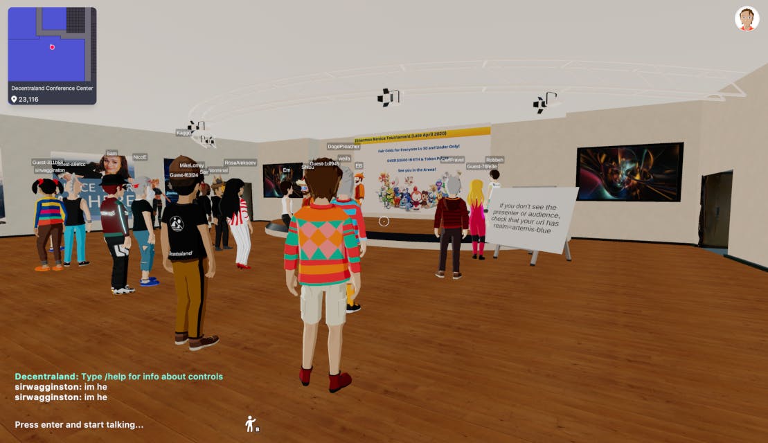 “Als er genoeg bezoekers zijn, is er een mogelijkheid om geld te verdienen”, stelt de in Australië gevestigde Matty Soudagar. Hij investeert in virtueel landgoed binnen Decentraland. Daarnaast organiseert hij onder de naam DCLBlogger wekelijks virtuele conferenties waar sprekers een publiek van tachtig tot honderd geïnteresseerden kunnen toespreken.