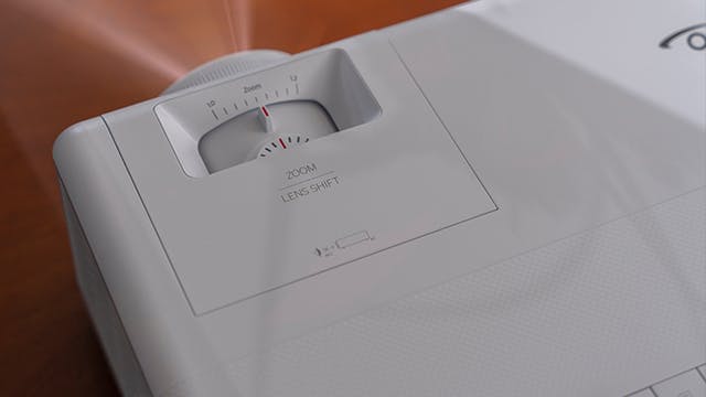 De opmars van Ultra Short Throw projectoren is indrukwekkend, maar ook dat laat de UHZ50 links liggen. Dit is een standaard long-throw projector, met een zoomlens van 1,3x. Een 100 inch beeld haal je vanop 2,68 tot 3,52m van het scherm. De onderzijde van het beeld ligt ongeveer ter hoogte van de lens, zodat je de projector best op een lage tafel zet of aan het plafond hangt. De focusring en zoomslider bedien je vlot manueel. De projector biedt ook 10% verticale lensshift, maar het draaiwiel is lastig te bedienen en de lensshift viel heel wat kleiner uit dan we dachten.