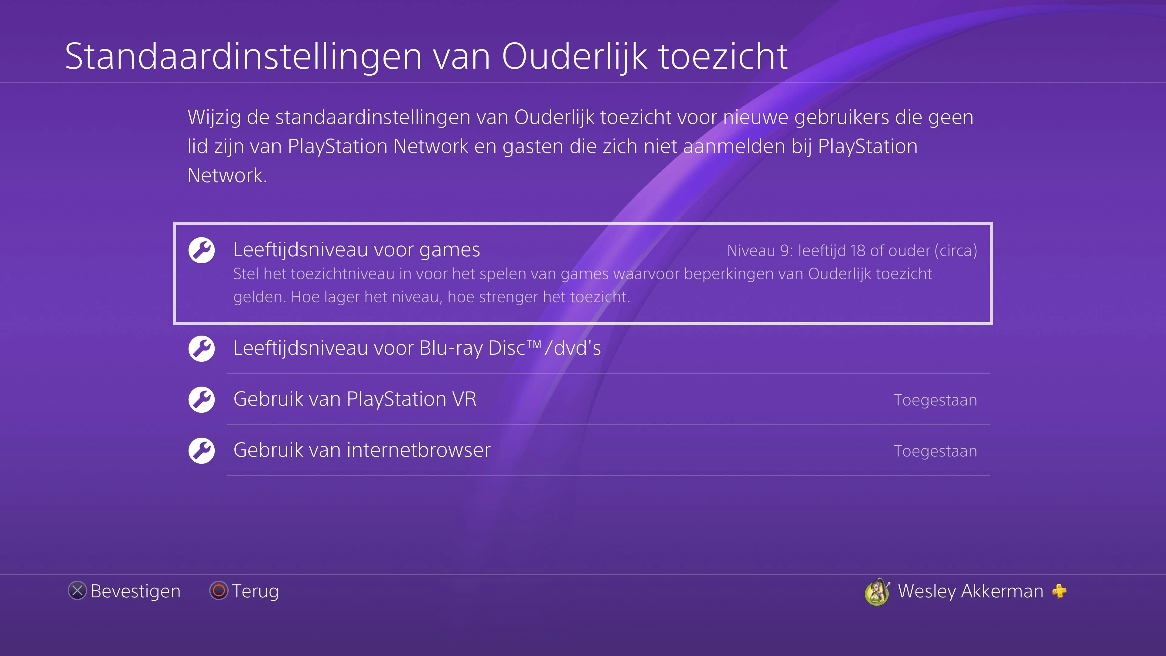 Onder ditzelfde kopje vind je ook de beperkingen voor leeftijdsrestricties. Als je kind nog te jong is voor Call of Duty, dan kan de PlayStation zo ingesteld worden dat die game niet opgestart kan worden. Onder Toepassingen / Apparaten /Netwerkfuncties stel je het leeftijdsniveau in. Dit gaat hand in hand met de PEGI-leeftijdskeuring die bijna alle games – zowel fysiek als digitaal – voor release toebedeeld krijgen. Onderop staan ook de opties Gebruik van PlayStation VR en Gebruik van internetbrowser. Hier kun je instellen of het gebruik ervan toestaat of niet; andere mogelijkheden zijn er niet.