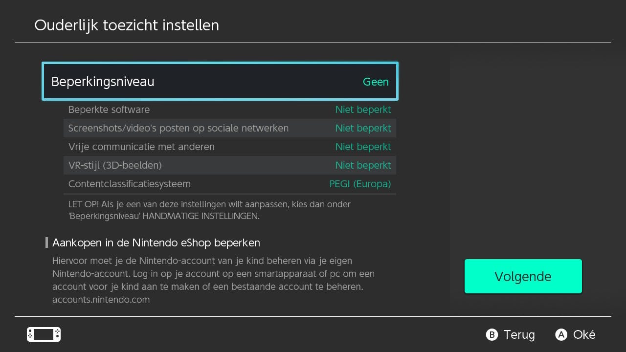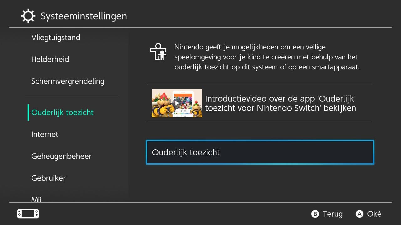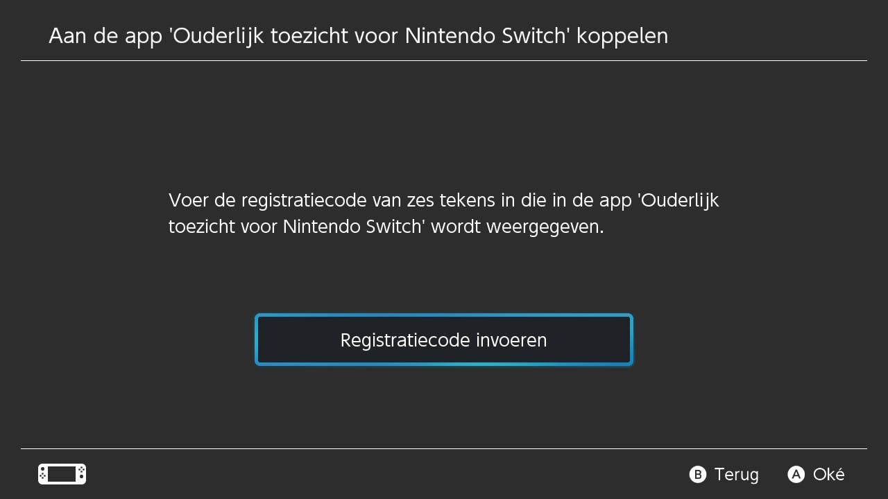 Als de gratis app eenmaal op je smartphone staat, dan dien je in te loggen met een Nintendo-account. Heb je die nog niet, zorg er dan voor dat je er eentje aanmaakt. Je moet als ouder of verzorger tenminste 18 jaar of ouder zijn om gebruik te kunnen maken van de mogelijkheden. Ga nu naar de Nintendo Switch die je wil instellen, verbind hem met het internet en ga naar Instellingen. Druk links in het menu op Ouderlijk toezicht. Rechts vind je nu de knop voor de koppeling met de applicatie.
