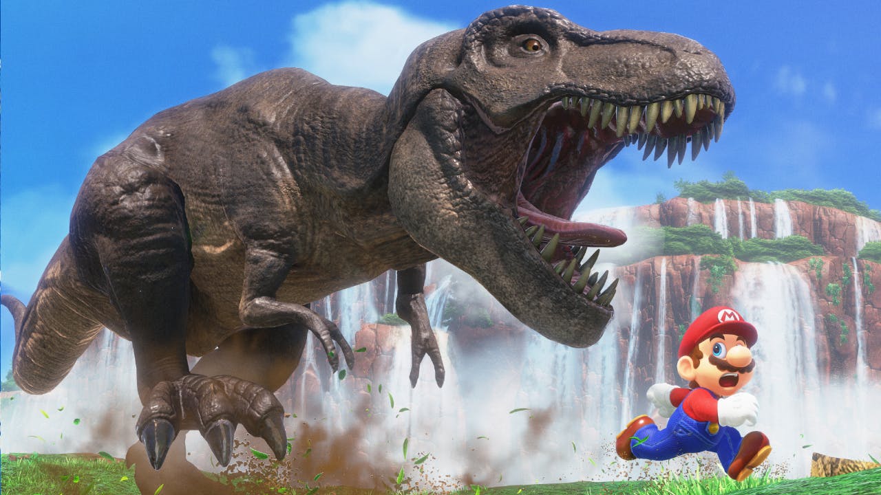 Gelukkig is deze training van korte duur en beland je snel in het zonnige Cascade Kingdom, waar het gras groener is dan bij de buren en een gigantische Tyrannosaurus Rex je meteen doet beseffen dat het overnemen van al die personages, objecten en vijanden voor zeer gevarieerde gameplay gaat zorgen.