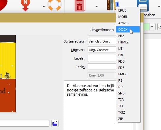 Het is ook mogelijk om boeken in Calibre om te zetten naar docx, zodat je ze kunt bewerken in bijvoorbeeld Microsoft Word of een andere tekstverwerker. Klik hiervoor met de rechtermuisknop op een boek en kies in het menu voor Boeken converteren / Individueel converteren. Kies nu rechtsboven achter Uitvoerformaat voor DOCX. Klik vervolgens op OK om het boek om te zetten. Bij het converteren wordt het oorspronkelijke formaat behouden en een kopie gemaakt in nieuwe formaat. Je kunt dit vervolgens openen door in de bibliotheek, wanneer je een boek hebt aangeklikt, aan de rechterkant (onderdeel Details) achter Formaten te klikken op DOCX.