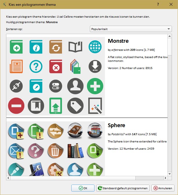 Ook interessant is hier het tabblad Hoofdvenster, waar je onder Pictogrammen thema ervoor kunt zorgen dat Calibre andere pictogrammen laat zien waarvan ook de grootte is aan te passen. Ook kun je voor een ander lettertype kiezen en kleuren veranderen.