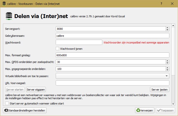 De meeste mensen verbinden hun e-reader, tablet of smartphone via een usb-kabel met de computer waarop Calibre staat, om e-books via de functie Naar apparaat sturen over te zetten. Een andere manier om dit (draadloos) te doen is door de ingebouwde Calibre-server in te schakelen. Dit doe je via de knop Verbinden/delen / Inhoudsserver starten. Je kunt dan, door het ip-adres van die computer op een ander apparaat in de browser in te typen en hier :8080 achter te zetten, overal in je netwerk bij je boeken. Calibre ondersteunt ook Open Publication Distribution System (opds), wat het delen nog makkelijker maakt. Installeer op je Android- of iOS-apparaat een app als Marvin, FBReader of een andere e-book-app die opds kent, en je kunt je collectie boeken heel eenvoudig op afstand doorzoeken en overzetten. Je kunt de server configureren via Voorkeuren / Delen via (Inter)net. Calibre Server gebruikt standaard geen https, waardoor de uitwisseling van gegevens niet veilig is. Gebruik deze server dan ook alleen binnen je eigen netwerk, tenzij je weet hoe je zelf een beveiligingslaag kunt aanbrengen.