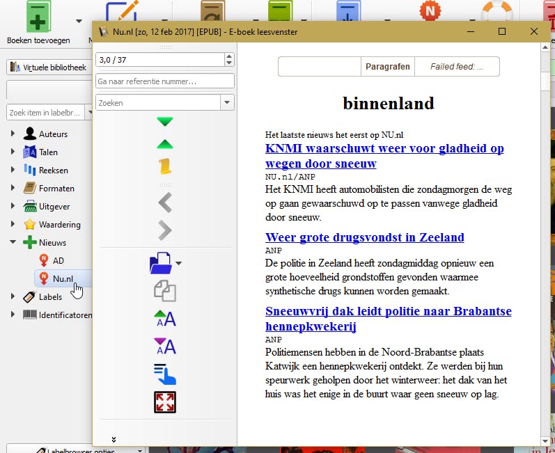 Het is in Calibre mogelijk om via rss allerlei nieuws uit externe bronnen te betrekken en er op gezette tijden automatisch een e-book of e-magazine van te maken. Standaard zijn er meer dan 1600 nieuwsbronnen in binnen- en buitenland waaruit je een selectie kunt maken: een handige manier om ervoor te zorgen dat de hoogtepunten dagelijks in Calibre – of je mobiele apparaat – in e-book-formaat worden getoond. Druk boven in de werkbalk op de knop Nieuws downloaden om een overzicht te krijgen van alle nieuwsbronnen, gerubriceerd op land. Maak je keuze en geef aan met welke frequentie het nieuws moet worden opgehaald. Nieuws dat is binnengehaald, vind je vervolgens links onder het label Nieuws. Calibre maakt gebruik van standaard rss-feeds voor het binnenhalen van nieuws. Wil je een andere nieuwsbron toevoegen, klik dan op het pijltje naast de knop Nieuws downloaden en kies voor Een aangepaste nieuwsbron toevoegen.