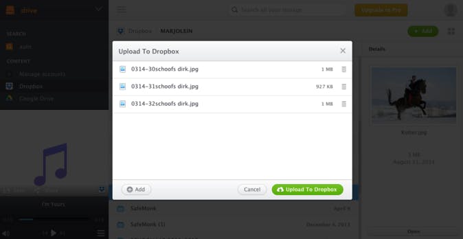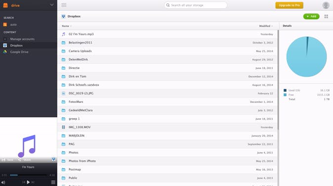Via de knop rechtsboven geef je aan of de bestanden en mappen in lijstvorm verschijnen of als kleine miniaturen. Wil je slechts op één drive werken, dan heb je de linkerkolom voor de navigatie in principe niet nodig. Om die linkerbalk te laten verdwijnen gebruik je de knop met de drie lijntjes. Bestanden uploaden naar je clouddiensten kan op twee manieren. Via de Add-knop selecteer je bestanden op de harde schijf die je naar de geselecteerde drive wilt uploaden. Sleep je liever vanuit een openstaand venster van je verkenner of Finder? Dat kan ook. Heb je bestanden toegevoegd, dan merk je dit aan een groen cirkeltje in de rechterbovenhoek. Hier zie je hoe de upload verloopt en hoeveel bestanden er worden toegevoegd. Deze cirkel is tevens de knop waar alle notificaties samenkomen, hier kun je alle activiteit bekijken en eventuele berichten lezen.