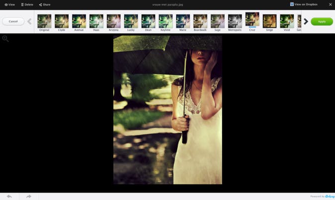 De bewerkingsmogelijkheden voor afbeeldingen zijn erg sterk. Jolicloud Drive gebruikt daarvoor de geïntegreerde Aviary-technologie. Je kunt de kleuren en belichting optimaliseren, de scherpte opkrikken, de afbeelding anders uitsnijden, een scherptediepte-effect toepassen en een hele waslijst aan filters toepassen.