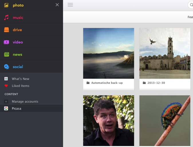 Nadat je de online opslagdiensten hebt verkend, kun je Jolicloud Drive koppelen aan een heleboel sociale netwerken, namelijk Facebook, Twitter, Google+, Tumblr, YouTube, Instagram, Vimeo, Instapaper, Flickr, Daily Motion, Feedly, Pocket, Picasa, Deezer, Rdio en SoundCloud. Je vindt deze koppelingen door in de linkerkolom op het pijltje naast Drive te klikken. Deze sociale netwerken zijn al gegroepeerd in knoppen Music, Photo, Video, News en Social. Het spreekt voor zich dat je iedere dienst afzonderlijk toestemming moet geven moet geven om te verbinden met Jolicloud Drive. De interactie met de sociale netwerken bestaat voornamelijk uit het lezen van de inhoud met beeld, geluid en video.