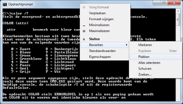 Standaard beland je in een venster met witte letters op een zwarte achtergrond, maar dat valt aan te passen. Je wijzigt de kleuren met het color-commando (dat je zoals alle commando's afsluit met Enter): color 1E bijvoorbeeld geeft je blauwe letters op een lichtgele achtergrond. Het commando color /? geeft mooi overzicht van de beschikbare kleuren. Met het commando cls maak je het venster netjes leeg. Met exit sluit je het venster weer. Wil je verder tekst uit Windows in zo'n opdrachtpromptvenster plakken, kopieer die tekst dan eerst met Ctrl+C naar het klembord, waarna je de titelbalk van het opdrachtpromptvenster met de rechtermuisknop aanklikt en Bewerken / Plakken kiest.