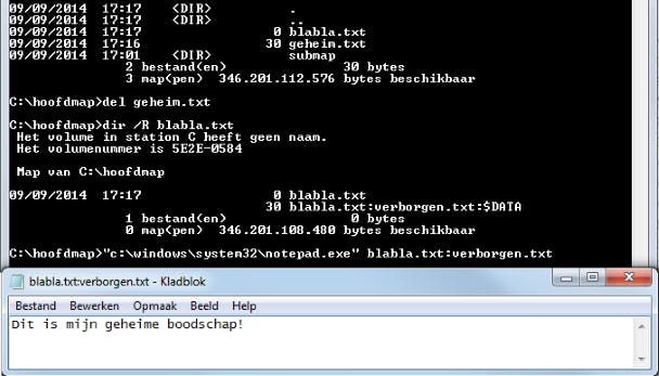 Velen weten niet dat Windows verschillende 'datastromen' aan een bestand laat koppelen. Zo'n extra datastroom kun je eventueel gebruiken om gegevens in een bestand te verbergen. Een klein experiment maakt dat duidelijk. Creëer (met Kladblok) een document dat je wilt verbergen, bijvoorbeeld geheim.txt. Vervolgens voer je in die map het volgende commando uit: type geheim.txt > blabla.txt:verborgen.txt. Hiermee neem je geheim.txt op in het (ogenschijnlijke lege) bestand blabla.txt. Het bestand geheim.txt mag je nu verwijderen (bijvoorbeeld met del geheim.txt). Voer je een dir-commando uit, dan lijkt blabla.txt leeg. Echter, via het commando dir /R krijg je alsnog die verborgen datastroom te zien. Om de inhoud van die datastroom te zien voer je het volgende commando uit: "c:\system32\notepad.exe" blabla.txt:verborgen.txt.