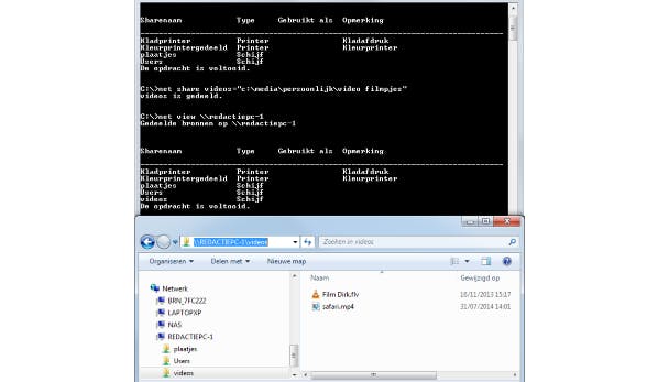 In Windows kun je bronnen als printers en mappen delen. Wil je snel een overzicht krijgen van deze gedeelde bronnen, voer dan het commando net view \\ in, bijvoorbeeld net view \\redactiepc1. Die computernaam lees je af in het venster dat je te zien krijgt wanneer je Windows-toets+Pause indrukt. Een nieuwe gedeelde netwerkmap creëer je met een commando als net share videos="c:\media\persoonlijk\video filmpjes". De gedeelde netwerkmap verwijder je weer met net share videos /delete. Het is ook mogelijk een gedeelde netwerkschijf permanent aan een vrije stationsletter te koppelen: net use x: \\""\ /persistent:yes (waarbij je x: vervangt door de gewenste stationsletter).