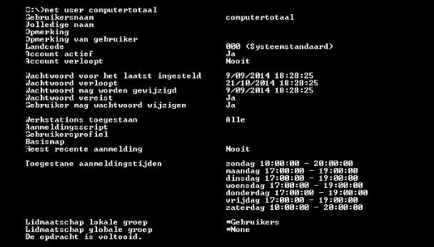 Via Windows Gebruikersaccountsbeheer voer je allerlei beheertaken voor Windows-accounts uit. Maar sommige taken laten zich alleen (of sneller) vanuit de opdrachtprompt uitvoeren. Wil je een bepaald account tijdelijk op non-actief zetten, dan volstaat een opdracht als net user /active:no (vervang no door yes om het weer te activeren). Of je zorgt ervoor dat een account zich alleen op bepaalde tijdstippen bij Windows kan aanmelden: net user /times:ma-vr,5pm-7pm;za-zo,10am-8pm. Met net user controleer je of de opdracht geslaagd is. Let op: vergeet bij deze commando's de slash niet (voor active en times), anders Windows denkt dat je het wachtwoord van het account wilt aanpassen!