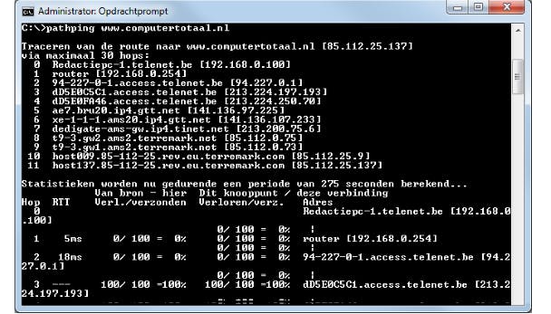 Er is ook een commando waarmee je kunt nagaan hoever de verbinding tussen je eigen pc en de beoogde server op het internet reikt. Immers, tussen je pc en zo'n server liggen vaak heel wat 'knooppunten' (zoals routers) en het valt niet uit te sluiten dat je connectie stokt bij een van die knooppunten. Probeer het gerust even uit met het volgende commando: tracert www.computertotaal.nl. Zo'n commando is trouwens erg informatief gezien je kunt nagaan langs welke route(rs) je verzoek zoal loopt. Overigens bevatten moderne Windows-versies ook het commando pathping, een combinatie van ping en tracert. Na de tracering en enig geduld volgen dan de reactiestatistieken.