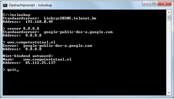 Wanneer je een webadres (URL) in je browser invult, dan zorgt een DNS (Domain Name Service) ervoor dat het netjes aan het bijhorende IP-adres wordt gekoppeld, zodat je browser met de webserver kan verbinden. Kun je wel nog IP-adressen, maar geen URL's meer bereiken, dan helpt het nslookup-commando je om de werking van de DNS-server te controleren. Voer nslookup uit en tik vervolgens server in, gevolgd door de naam of het IP-adres van de DNS-server die je wilt testen. Druk nu op de Enter-toets en vul een willekeurig webadres in, zoals www.computertotaal.nl. Krijg je nu time-outs te zien, dan is er blijkbaar een probleem met de ingestelde dns-server.