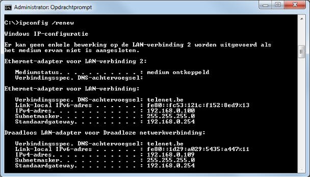 Een snelle manier om over je thuisnetwerk allerlei informatie op te vragen, is via het commando ipconfig. Op deze manier zie je onder meer welke (al dan niet draadloze) LAN-adapters actief zijn, welk IP-adres die adapters hebben, en wat het adres van je standaardgateway (oftewel router) is, zodat je dit adres in je browser kunt intikken om naar de webinterface van dat apparaat te gaan. Wil je ook de DNS-server(s) en de MAC-adressen van de netwerkadapters weten en wil je weten of DHCP actief is, gebruik dan ipconfig /all. Verder kan het bij connectieproblemen helpen om even alle adressen vrij te geven met ipconfig /release en die opnieuw in te stellen met ipconfig /renew.