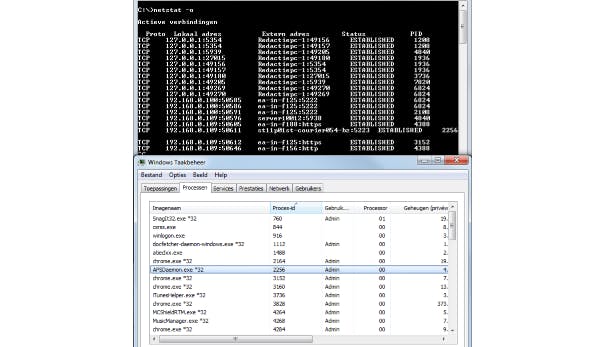 Het commando netstat geeft je een overzicht van de actieve verbindingen, inclusief IP-adres en poortnummer van zender en ontvanger. Voer ook eens de opdracht netstat /? uit om een idee te krijgen van de talrijke parameters. Zo geeft netstat -s je een mooi statistisch overzicht per netwerkprotocol (IP, ICMP, TCP en UDP), wat handig kan zijn bij het oplossen van netwerkproblemen. Met netstat -o krijg je ook de PID (process identifier) te zien van de processen. Via Windows Taakbeheer, waar je Beeld / Kolommen selecteren / Proces-id selecteert, kun je dan te weten komen welke toepassingen daarvoor verantwoordelijk zijn.