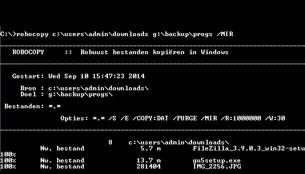 De kans is groot dat je vaak bestanden en mappen via Verkenner kopieert. Veel flexibiliteit biedt die omgeving echter niet, althans niet wanneer je de mogelijkheden vergelijkt met het commando robocopy. Via robocopy /? krijg je alvast een overzicht van het indrukwekkend aantal parameters. Eén voorbeeld: met robocopy c:\media g:\backup\media /MIR (MIR staat voor mirror) wordt de bronmap (c:\media) automatisch gespiegeld met de doelmap (g:\backup\media). Handig is ook de mogelijkheid om opdrachten op te slaan: je hoeft hiervoor maar de parameter /SAVE: toe te voegen. Met het commando robocopy /JOB: voer je die opdracht dan netjes weer uit.