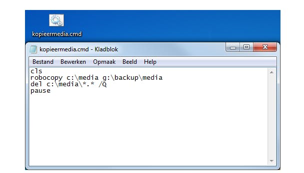 Een belangrijk voordeel van opdrachtregelcommando's is ook dat je verschillende opdrachten na elkaar in een batchbestand kunt opnemen, zodat die één voor één worden uitgevoerd zodra je het batchbestand aanroept (dat laatste kan overigens ook via de taakplanner van Windows). Zo'n batchbestand is niets anders dan een tekstbestand met de extensie .bat of .cmd, dat je bijvoorbeeld met Kladblok aanmaakt. Een eenvoudig voorbeeld ter illustratie:
