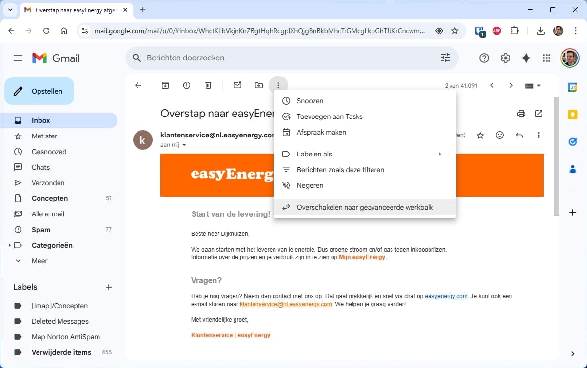 Gmail introduceerde vorig jaar een vereenvoudigde werkbalk met minder functies. Het snoozen van berichten, toevoegen van taken en diverse andere opties liggen hierdoor ietwat verstopt. Gelukkig kun je de oude vertrouwde werkbalk herstellen. Log hiervoor in op https://mail.google.com en open een willekeurige e-mail. Klik vervolgens bovenin aan de rechterkant van de werkbalk op de drie puntjes. Kies in het submenu Overschakelen naar geavanceerde werkbalk.