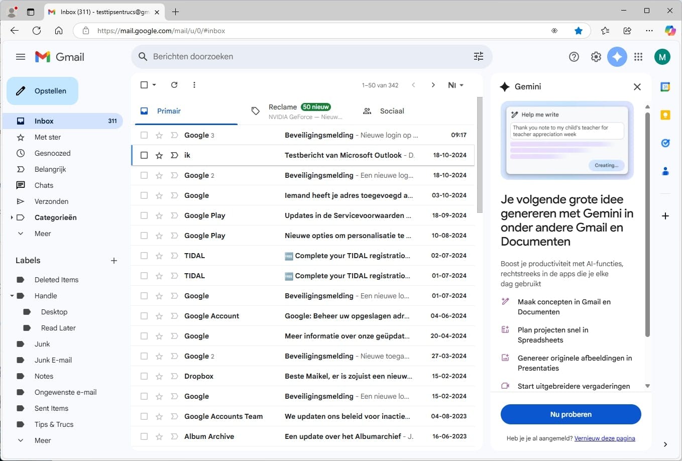 Met Gemini (voorheen Bard) sprong Google zo'n twee jaar geleden óók op de AI-trein. Deze chatbot is in principe een betaalde functie, maar Gmail-gebruikers kunnen het desgewenst gratis uitproberen. Klik rechtsboven op het pictogram Probeer Gemini en bevestig met Nu proberen of Probeer dit nu kosteloos uit. Er verschijnt een betaalpagina. Je kunt deze functie twee weken of een maand gratis gebruiken, maar daarna kost het abonnement geld (inclusief 2 TB opslag).