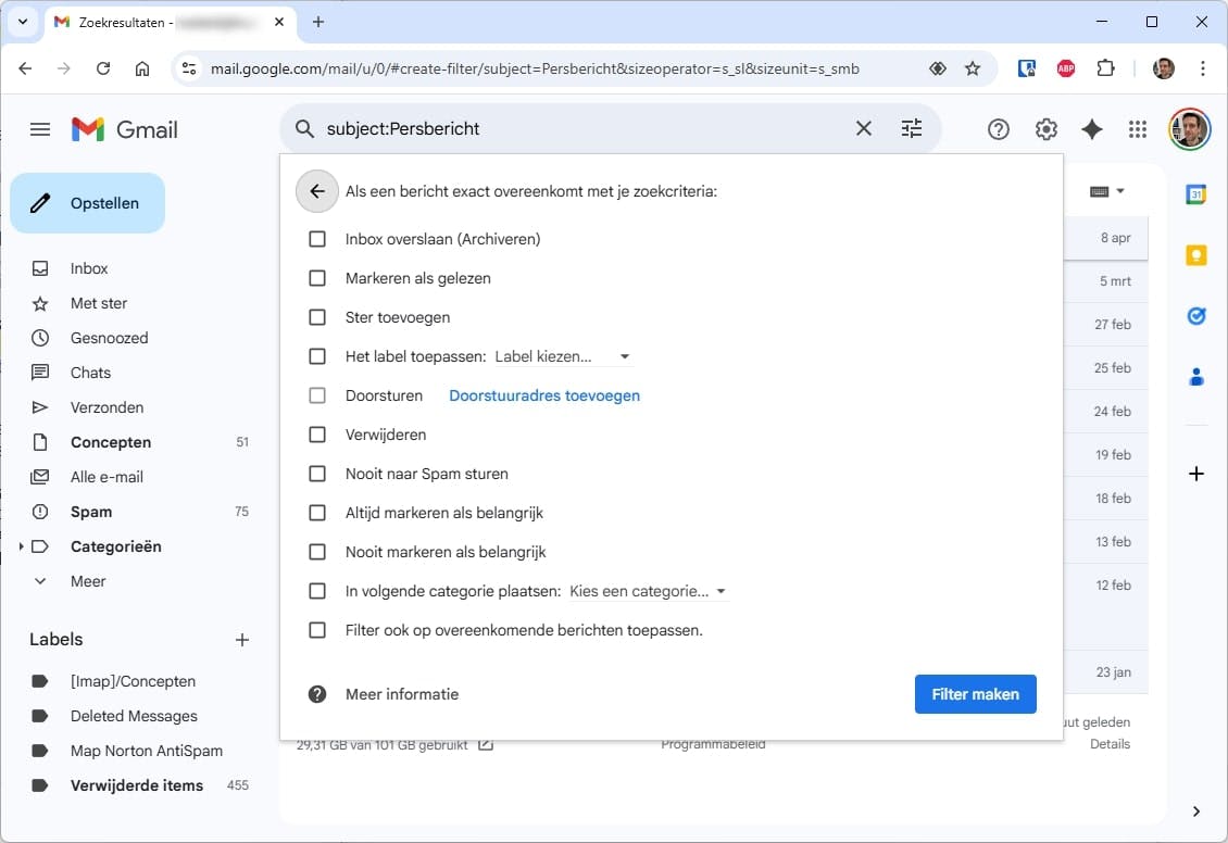Je kunt nu bepaalde criteria opgeven zoals afzender, onderwerp of specifieke woorden. Zodra je bevestigt met Filter maken, bepaal je wat er met deze e-mails moet gebeuren. Denk onder meer aan archiveren, markeren als gelezen of naar een specifieke map verplaatsen. Maak een keuze en klik als laatste nog een keer op Filter maken.