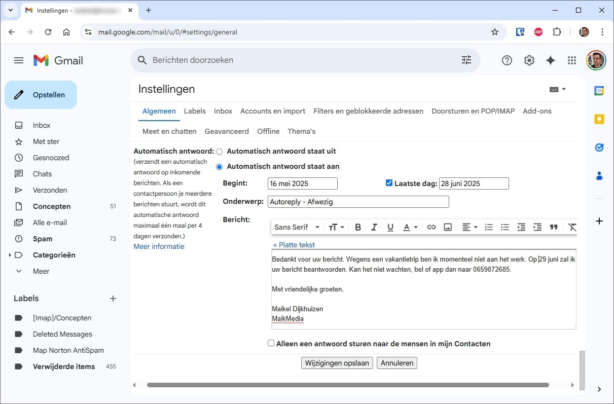 Ga je op vakantie? Misschien check je dan niet steeds je e-mail. Je kunt een automatisch antwoord instellen voor wanneer je niet beschikbaar bent. Je navigeert hiervoor naar Instellingen / Alle instellingen bekijken en scrolt omlaag totdat je het onderdeel Automatisch antwoord tegenkomt. Activeer de optie Automatisch antwoord staat aan. Verder selecteer je de eerste en laatste dag van jouw vakantie. Bedenk ook een geschikt Onderwerp, bijvoorbeeld 'Automatisch antwoord'. Typ nu het afwezigheidsbericht en gebruik hierbij eventueel de opmaakfuncties bovenin de werkbalk. Klik onderaan op Wijzigingen opslaan.