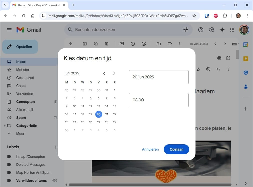 Je kunt e-mails inplannen om ze op een later tijdstip automatisch te verzenden. Maak met Opstellen een nieuwe e-mail op en klik naast Sturen op het driehoekje. Zodra je klikt op Sturen plannen verschijnt er een vers venster. Je kunt eventueel een van de voorgestelde data kiezen. Verzend je de e-mail liever op een specifiek moment, dan klik je op Kies datum en tijd. Wanneer je eenmaal een datum en tijdstip hebt gekozen, bevestig je met Sturen plannen.