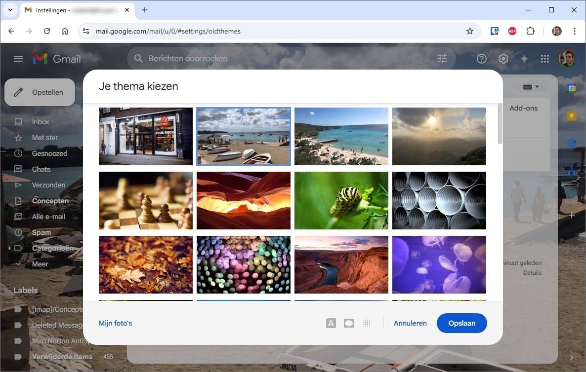 Gmail oogt met de standaardinstellingen nogal witjes. Je kunt de achtergrond van de webmaildienst eventueel donker maken. Vooral in de avond is dat rustiger voor de ogen. Navigeer naar Instellingen / Alle instellingen bekijken en klik op het tabblad Thema's. Via Thema instellen opent er een venster met diverse fraaie foto's. Die kun je trouwens óók als achtergrond van Gmail instellen. Als je liever een zwarte achtergrond wilt, scrol je een stukje omlaag. Klik op het thema Donker om de weergave meteen te wijzigen. Bewaar de wijzigingen met Opslaan.