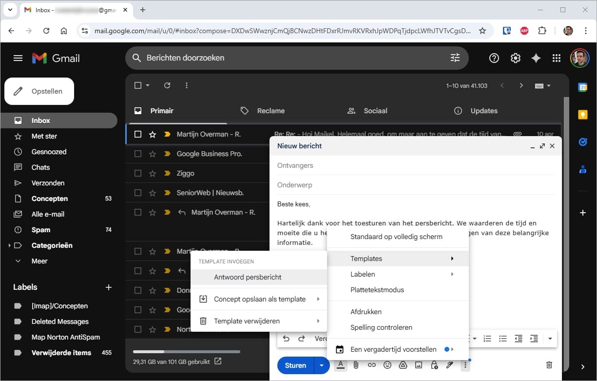 Wil je de inhoud van dit bericht vaker gebruiken? Klik dan in de werkbalk op de drie puntjes en kies achtereenvolgens Templates / Concept opslaan als template / Opslaan als nieuwe template. Je geeft het sjabloon daarna een relevante naam en kiest Opslaan. Via de drie puntjes en Templates kun je voortaan opgeslagen sjablonen invoegen.