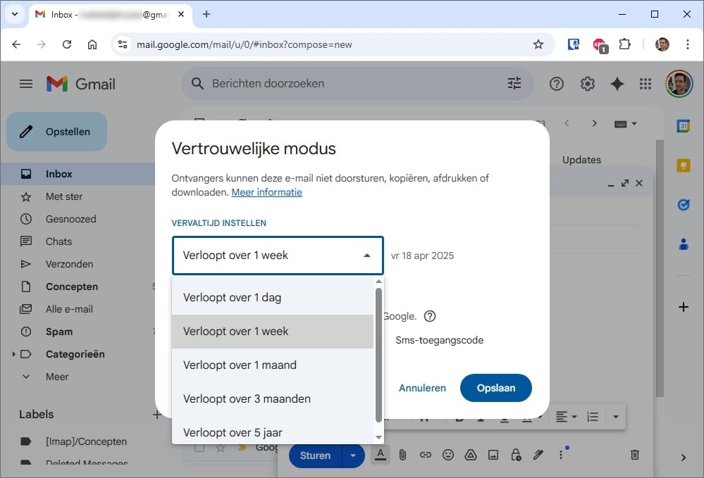 Gmail heeft een vertrouwelijke modus waarmee je (privacy)gevoelige gegevens kunt beschermen. Ontvangers kunnen de bewuste e-mail dan niet doorsturen, kopiëren, afdrukken en downloaden. Stel een nieuwe e-mail op en klik in de werkbalk op Vertrouwelijke modus aan-/uitzetten (pictogram met hangslotje). Stel naar eigen inzicht een vervaldatum in en voeg een toegangscode toe. Klik tot slot op Opslaan. Je creëert zo een extra beschermingslaag voor gevoelige informatie.