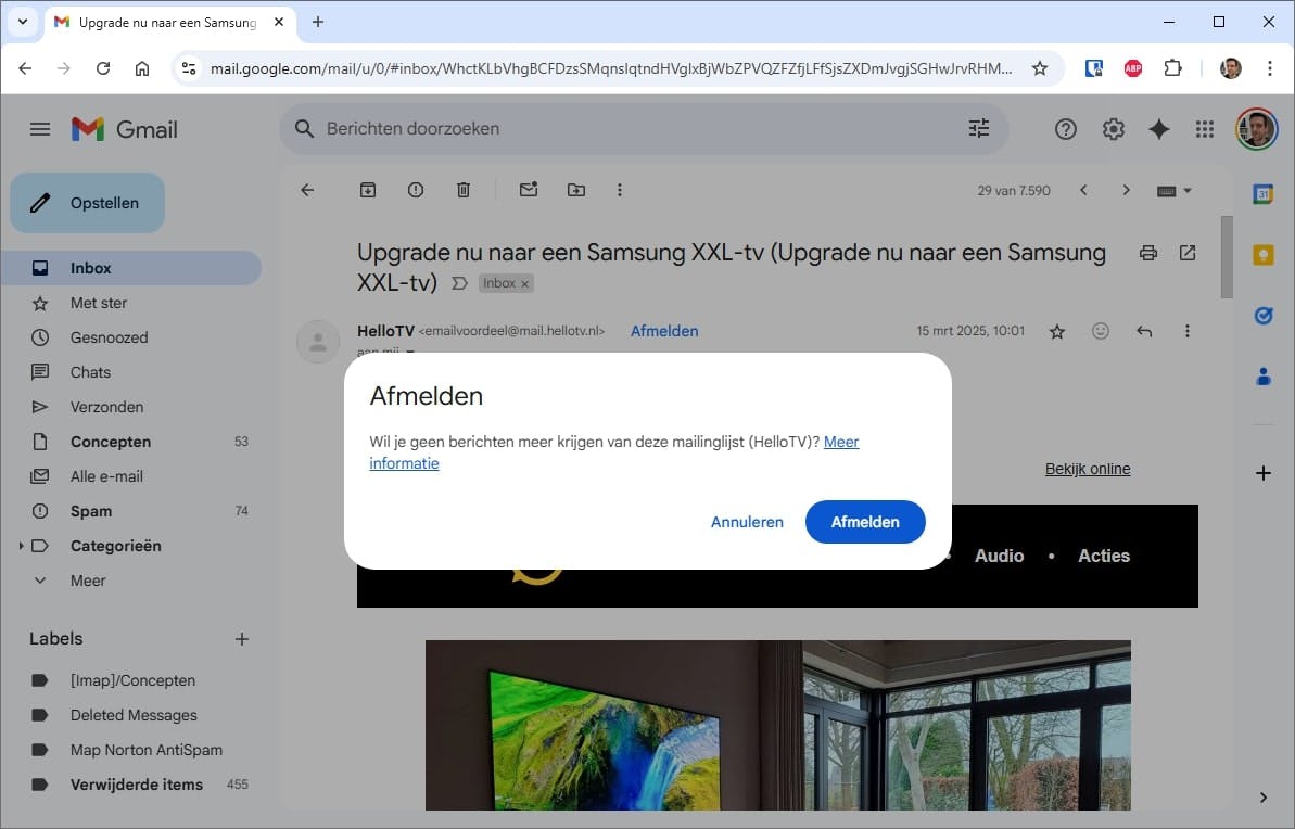 Ben je berichten van een specifieke afzender zat, zoals hardnekkige promotiemails of oninteressante nieuwsbrieven? Hoewel er onderaan de e-mail vaak een mogelijkheid is om jezelf uit te schrijven, is deze optie lang niet altijd makkelijk te vinden. Gmail kan je helpen. Bij terugkerende e-mails verschijnt achter de afzender de optie Afmelden. Klik daarop en kies in het venster wederom voor Afmelden. Er verschijnt vervolgens een bevestiging. Houd er rekening mee dat de uitschrijffunctie niet voor elke inkomende e-mail beschikbaar is.