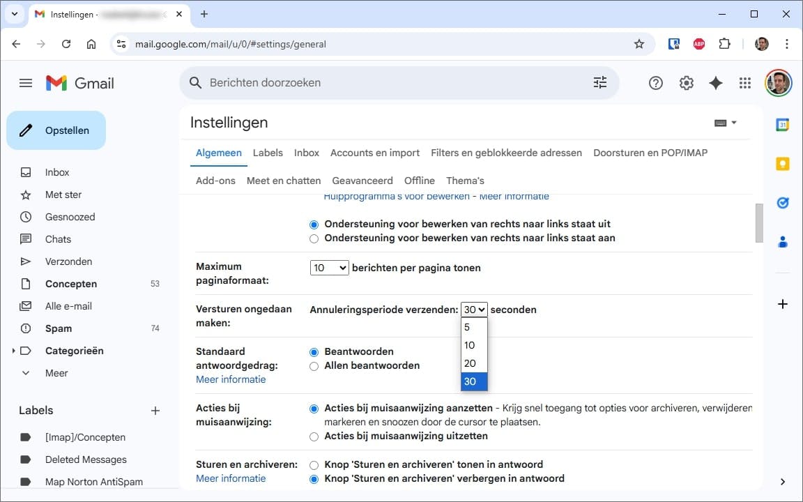 Als je een e-mail verstuurt, kun je de bezorging weer intrekken. Klik in dat geval op Ongedaan maken. Handel wel snel, want deze optie verschijnt maar kort. Je kunt de bedenktijd wel iets verlengen. Ga naar Instellingen / Alle instellingen bekijken en klik achter Versturen ongedaan maken op het uitrolmenu. Je kiest tussen vijf, tien, twintig óf dertig seconden. Bewaar de instellingen via Wijzigingen opslaan.