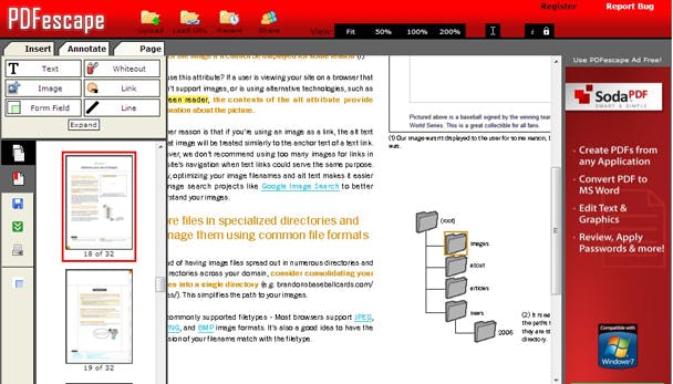 Bij het bewerken kun je kiezen uit verschillende opties: voeg een pagina in (of haal er een weg), voeg objecten en tekstblokken toe, verwijder tekst, enzovoorts. Daarnaast werkt PDFescape ook erg handig bij het aanwijzen van aanpassingen, je kunt namelijk vormen, pijlen en notities toevoegen. Het programma kan helaas niet zonder registratie gratis worden gebruikt en een betaald account heeft wel enkele voordelen, waaronder het online opslaan van je documenten.