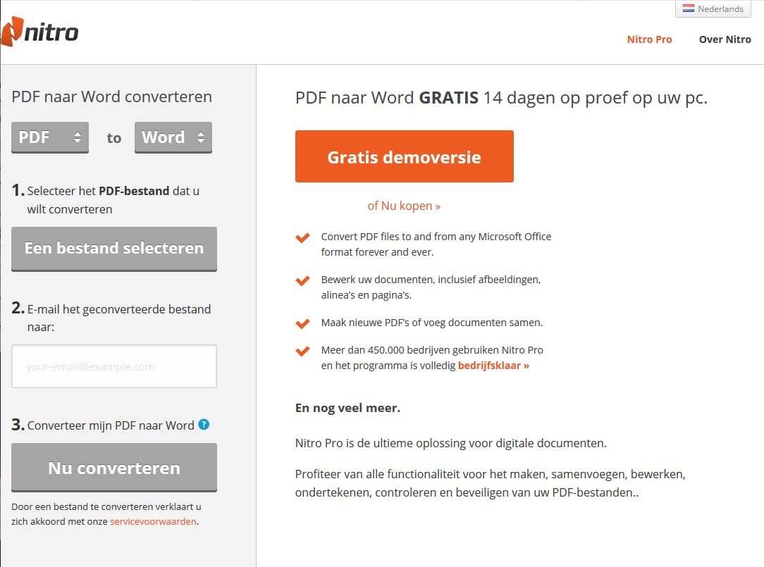 Mocht Nitro Cloud niet helemaal bevallen, dan zijn er ook veel alternatieven die het mogelijk maken om PFD-bestanden te converteren naar Word-documenten, zelf zonder dat je daarvoor software hoeft te installeren. Zo is er bijvoorbeeld smallpfd.com of www.2pdf.nl. Over converteren gesproken: in Word is het ook mogelijk je bestand op te slaan als PDF-bestand. Ga hiervoor naar Bestand / Exporteren.
