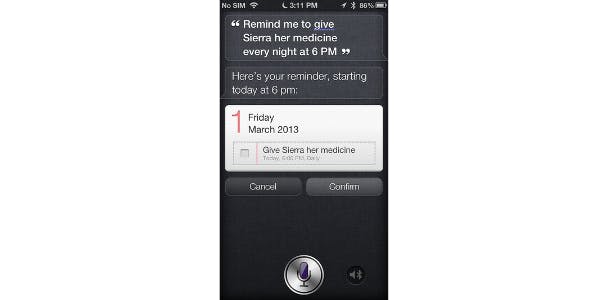 Zo kan Siri rekenwerk met data voor me doen. Toen ik me aanmeldde voor een gratis proef bij een premium webservice, werd mij verteld dat ik moest gaan betalen als ik niet in de komende twintig dagen zou opzeggen. Dus zei ik tegen Siri: “Herinner mij eraan om over negentien dagen om 10 uur ’s ochtends te beslissen over deze webservice." Siri weet precies wat te doen.
